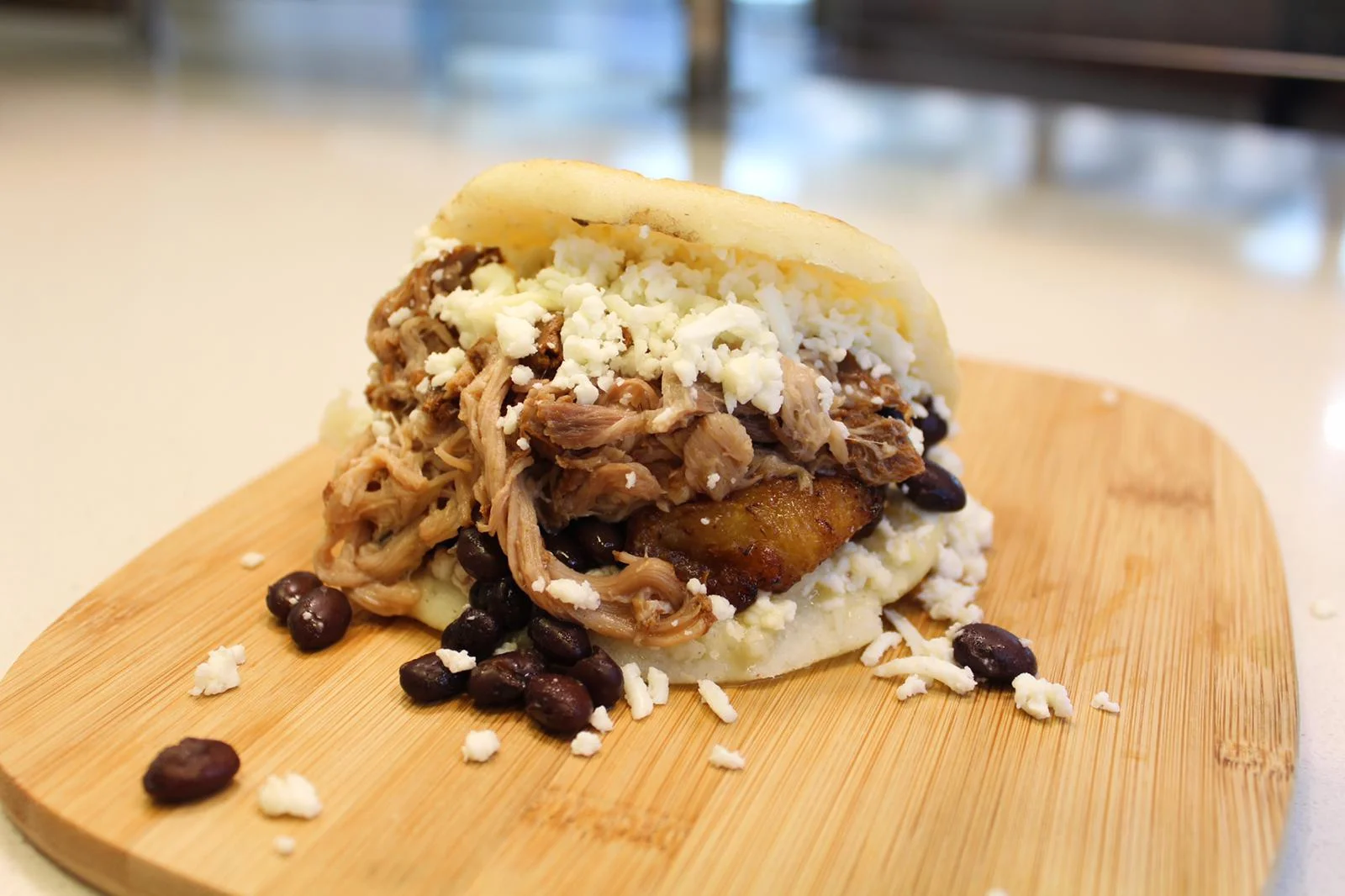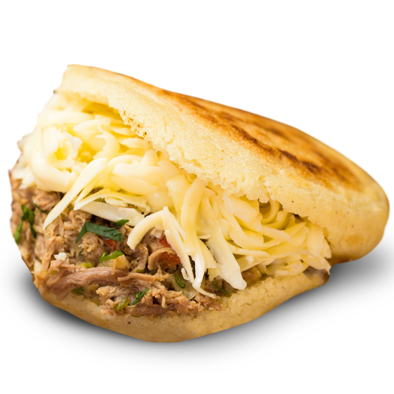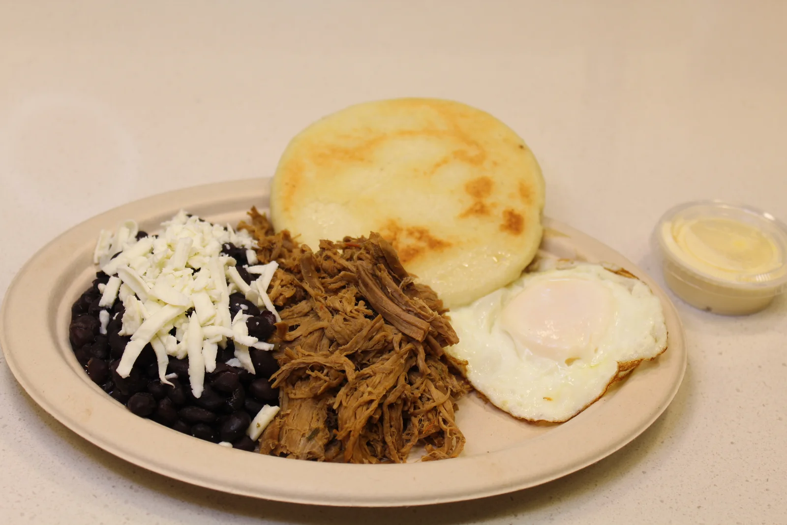 Choice of meat: Shredded beef , chicken or pork , served whith black beans, cheese, one sunny egg, plain arepa