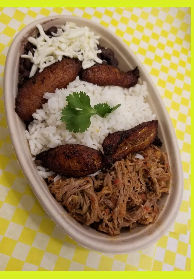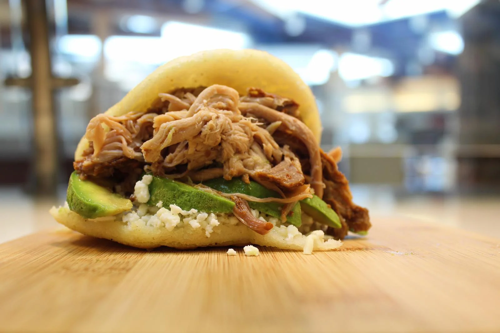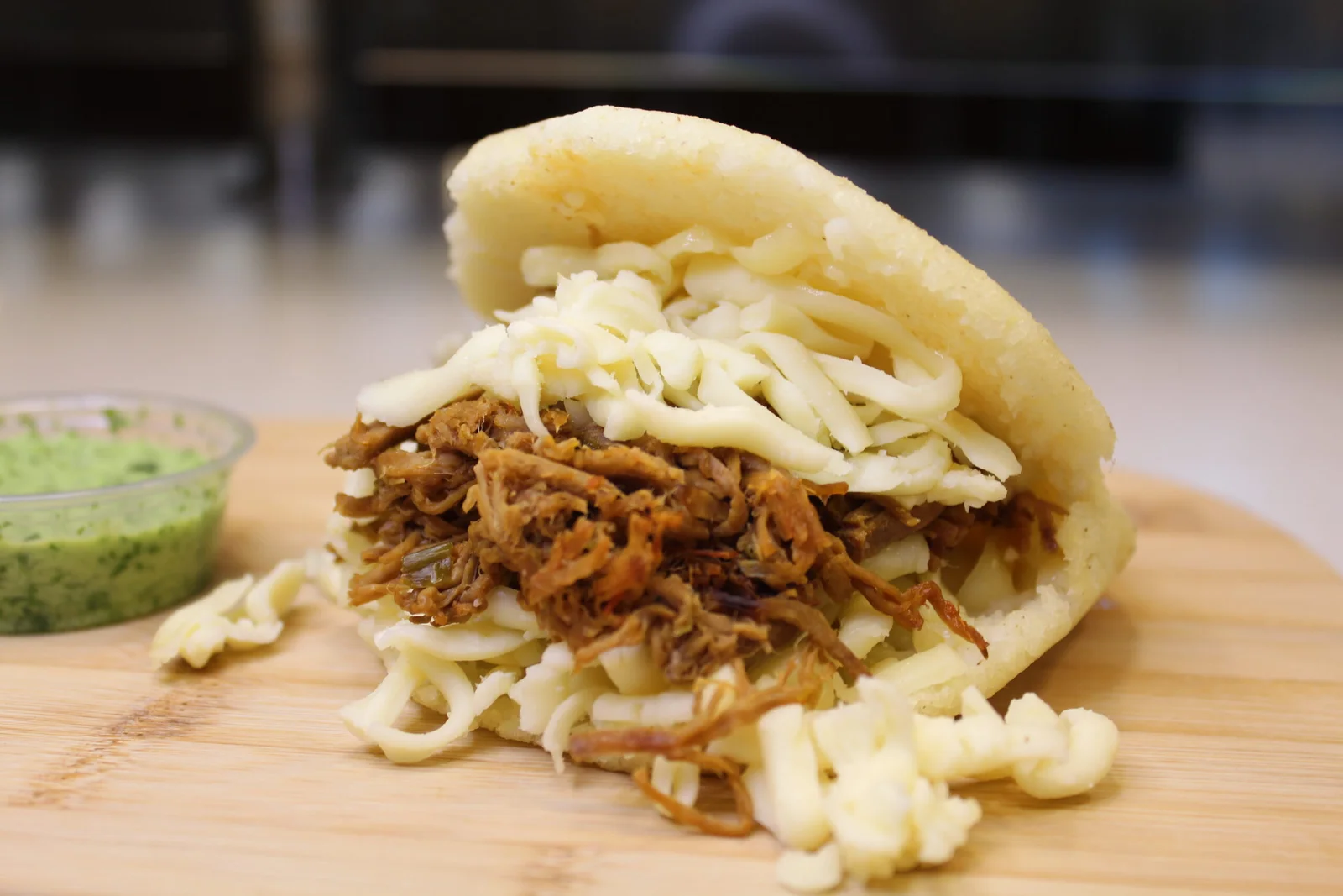 Choice of meat: Shredded beef , chicken or pork , served whith black beans, cheese, one sunny egg, plain arepa