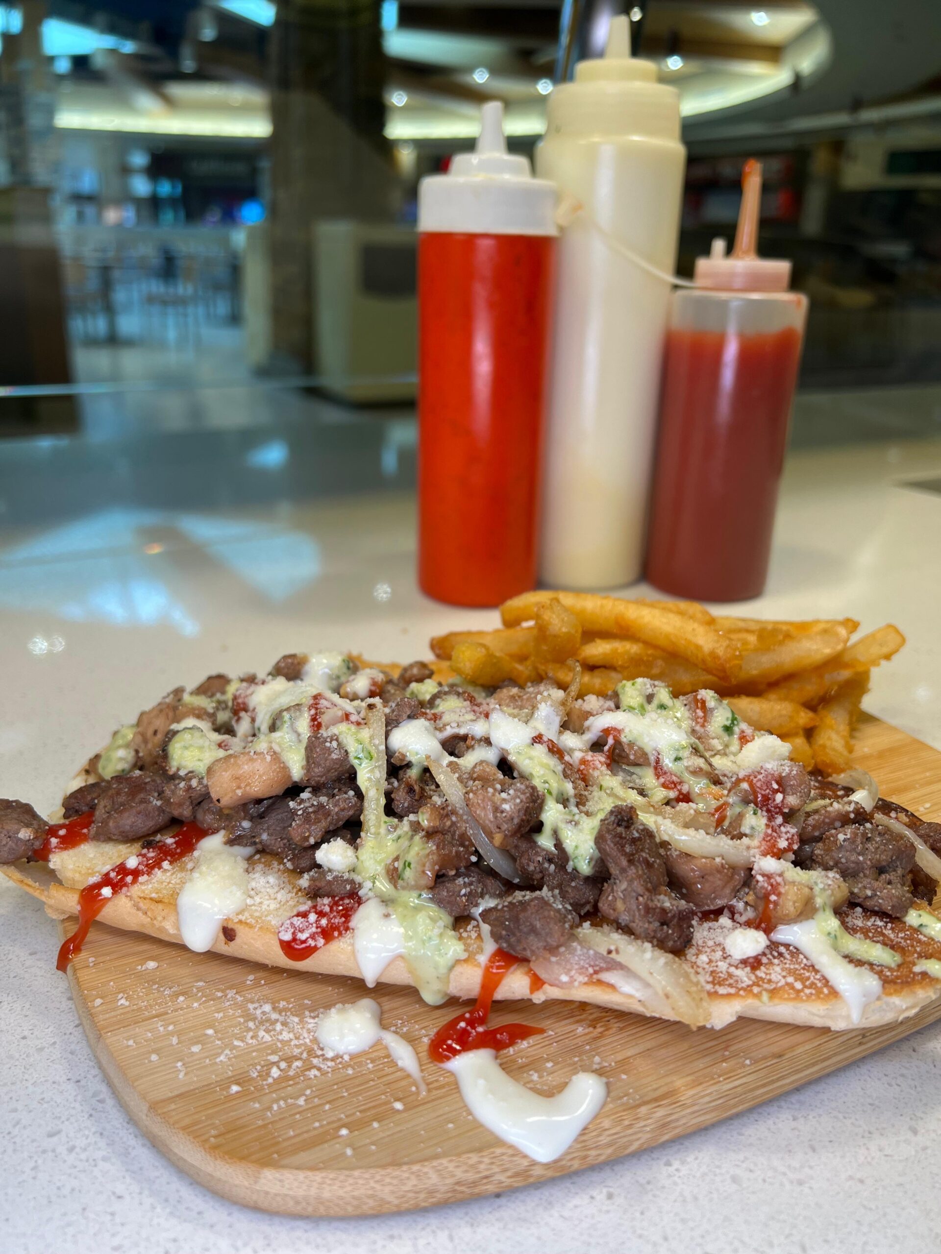 Philly steak venezuelan version , diced beef and chicken , bread, cheese, house sauce ,ketchup , french fries